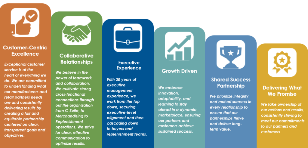 We build strong, collaborative relationships between manufacturers and retailers to maximize product sell-through and sales growth. We are committed to our customers and strive to build long lasting, successful relationships through hard work, the highest degree of integrity and empathy.